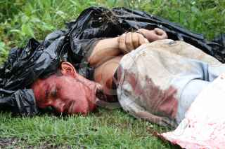 LA UNIÓN, GUERRERO 16AGOSTO2009.- Un hombre desconocido fue decapitado y hallado esta mañana por efectivos de la Armada de México sobre la carretera federal Zihuatanejo-La Unión. El cuerpo tenía encima un narcomensaje con la siguiente leyenda: "Comandante Ortega te llevaste a seis de Petacalco y esto es un aviso de lo que te voy a hacer a tí y a todas las corporaciones que te apoyan. Atte. Adaly Tapia. F. M.". FOTO: CHUY MEZA/CUARTOSCURO.COM