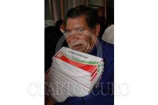 NEZAHUALCÓYOTL, EDO. DE MÉXICO, 20AGOSTO2009.- Un hombre sale de la sesión de cabildo con los nombres que identifican a los nuevos regidores y sindicos del gobierno local. FOTO. MARIO NULO/CUARTOSCURO.COM