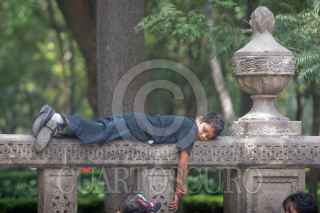 MÉXICO, D.F., 21AGOSTO2009.- Un niño toma una sienta en una de las bacas de la Alameda central. FOTO: RICARDO CASTELAN/CUARTOSCURO.COM