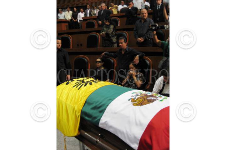CHILPANCINGO, GUERRERO, 21AGOSTO2009.- En el congreso guerrerense se realizó el homenaje a Armando Chavarría, diputado perredista que fuera acribillado el día de ayer por un par de sujetos al salir de su domicilio. Entre los cargos que desempeño fue el del presidente del congreso local y se le señalaba en un futuro como posible candidato a la gubernatura. Lo acompañaron su familia, amigos y compañeros de partido, que en todo momento han destacado que se trato de un asesinato político. En el ataúd se coloco la bandera nacional y la bandera amarilla del PRD. FOTO: OSCAR ALVARADO/CUARTOSCURO.COM