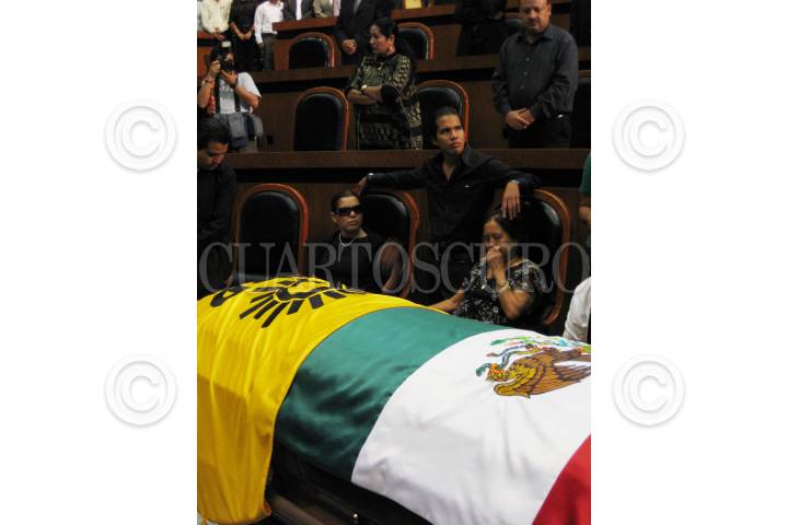 CHILPANCINGO, GUERRERO, 21AGOSTO2009.- En el congreso guerrerense se realizó el homenaje a Armando Chavarría, diputado perredista que fuera acribillado el día de ayer por un par de sujetos al salir de su domicilio. Entre los cargos que desempeño fue el del presidente del congreso local y se le señalaba en un futuro como posible candidato a la gubernatura. Lo acompañaron su familia, amigos y compañeros de partido, que en todo momento han destacado que se trato de un asesinato político. En el ataúd se coloco la bandera nacional y la bandera amarilla del PRD. FOTO: OSCAR ALVARADO/CUARTOSCURO.COM
