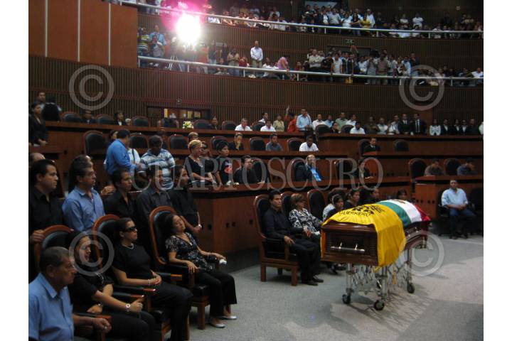 CHILPANCINGO, GUERRERO, 21AGOSTO2009.- En el congreso guerrerense se realizó el homenaje a Armando Chavarría, diputado perredista que fuera acribillado el día de ayer por un par de sujetos al salir de su domicilio. Entre los cargos que desempeño fue el del presidente del congreso local y se le señalaba en un futuro como posible candidato a la gubernatura. Lo acompañaron su familia, amigos y compañeros de partido, que en todo momento han destacado que se trato de un asesinato político. En el ataúd se coloco la bandera nacional y la bandera amarilla del PRD. FOTO: OSCAR ALVARADO/CUARTOSCURO.COM