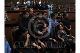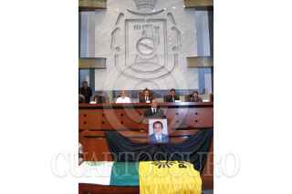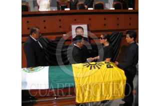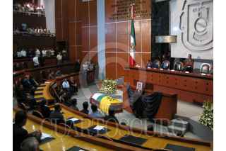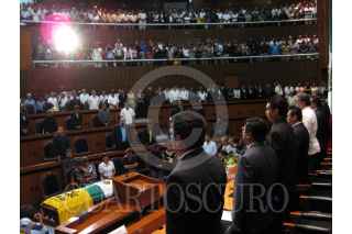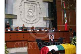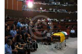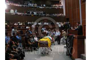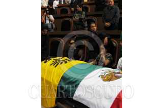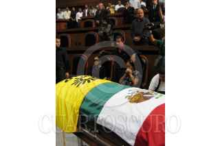 CHILPANCINGO, GUERRERO, 21AGOSTO2009.- En el congreso guerrerense se realizó el homenaje a Armando Chavarría, diputado perredista que fuera acribillado el día de ayer por un par de sujetos al salir de su domicilio. Entre los cargos que desempeño fue el del presidente del congreso local y se le señalaba en un futuro como posible candidato a la gubernatura. Lo acompañaron su familia, amigos y compañeros de partido, que en todo momento han destacado que se trato de un asesinato político. En el ataúd se coloco la bandera nacional y la bandera amarilla del PRD. FOTO: OSCAR ALVARADO/CUARTOSCURO.COM