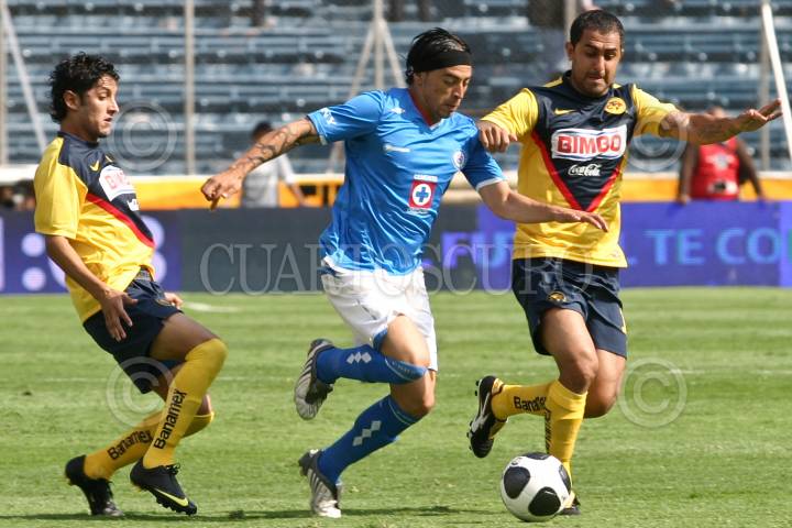 MÉXICO, D.F., 22AGOSTO2009.- Enrique Meza, director técnico de la Maquina Celeste del Cruz Azul saluda a Jesús Ramírez de las Águilas del Ámerica previo al juego en que las Aguilas derrotaran 3 - 2 al conjunto celeste en el estadio Azul en partido de la jornada 5 del torneo Apertura 2009. FOTO: RODOLFO ANGULO/CUARTOSCURO.COM
