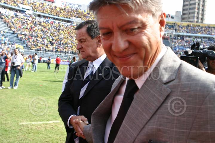 MÉXICO, D.F., 22AGOSTO2009.- Enrique Meza, director técnico de la Maquina Celeste del Cruz Azul saluda a Jesús Ramírez de las Águilas del Ámerica previo al juego en que las Aguilas derrotaran 3 - 2 al conjunto celeste en el estadio Azul en partido de la jornada 5 del torneo Apertura 2009. FOTO: RODOLFO ANGULO/CUARTOSCURO.COM
