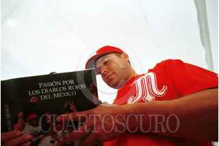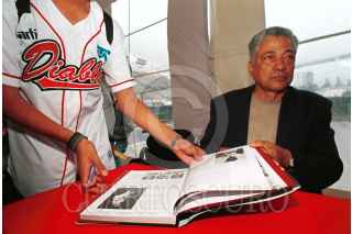 Alfredo Ortíz, el mejor pitcher zurdo en la história del beisbol de la liga mexicana y ex jugador de los Diablos Rojos, regala autógrafos a los fanáticos. FOTO: Oswaldo Ramírez/CUARTOSCURO.COM