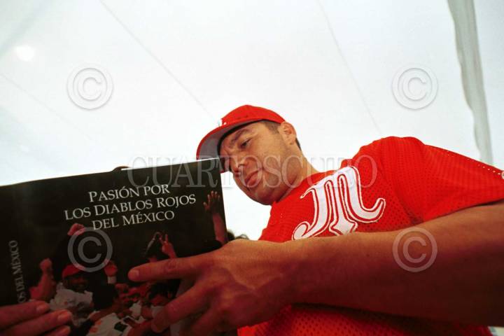 Alfredo Ortíz, el mejor pitcher zurdo en la história del beisbol de la liga mexicana y ex jugador de los Diablos Rojos, regala autógrafos a los fanáticos. FOTO: Oswaldo Ramírez/CUARTOSCURO.COM
