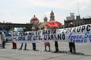 TOLUCA, ESTADO DE MÉXICO, 26AGOSTO2009.- Vecinos del fraccionamiento Hacienda Santo Tomás, perteneciente al municipio de Nicolás Romero, se manifestarón a las afueras del Palacio de Gobierno en contra del gobernador de este estado, Enrique Peña Nieto, por la falta de servicios básicos desde hace 10 años atras. Los manifestantes argumentan que la empresa Cooperativa de Vivienda y Consumo Nuestro Hogar S.C de R.L., se comprometió a dotar a cada uno de los mil 239 predios de servicios, y denuncian que funcionarios de la Secretaría de Desarrollo Urbano han incurrido en desvió de recursos que estaban destinados a la construcción de estos faltantes. FOTO: MISAEL VALTIERRA/CUARTOSCURO.COM