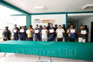 VILLAHERMOSA, TABASCO, 27AGOSTO2009.- Esta tarde en las instalaciones de la Policía Ministerial fue presentado un grupo de policías municipales que fueron capturados por las fuerzas castrense y SIEDO. Los hoy detenidos se encuentran confesos y en su mayoría reconocen participar con la célula de los “Zetas” a quienes les brindaban todo tipo de protección, avisaban de operativos, participaban en ejecuciones y recibían entre 20 mil y 30 mil pesos mensuales. FOTO: MARCO POLO GUZMÁN HERNÁNDEZ/CUARTOSCURO.COM