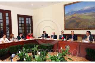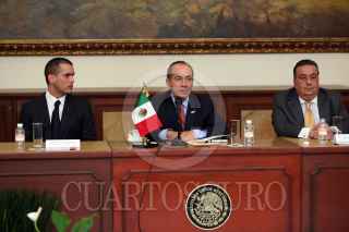MEXICO D.F., 27AGOSTO2009.- Felipe Calderon Hinojosa, Presidente de México y Fernando Gómez-Mont, Secretario de Gobernación, recibieron a los diputados electos del grupo parlamentario del Partido Verde Ecologista de México (PVEM). En la imagen, Emilio González Martínez, Coordinador de bancada. FOTO: ALFREDO GUERRERO/CUARTOSCURO.COM