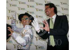 MÉXICO, D.F., 28AGOSTO2009.- El imitador oficial de Michael Jackson "Héctor Jackson" y Javier Hidalgo titular del Instituto de la Juventud, durante la conferencia de prensa donde se anuncio que el próximo sábado se tratara de romper un nuevo récord mundial en cuanto mayor número de personas bailando la coreografía de la canción Thriller del recién fallecido Michael Jackson. FOTO:RICARDO CASTELAN/CUARTOSCURO.COM