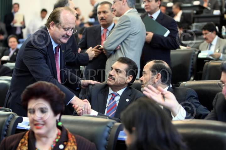 MÉXICO, D.F., 03SEPTIEMBRE2009.- Los senadores del PAN Ricardo Garcia Cervantes y Humberto Andrade dialogan con los senadores del PRD Carlos Navarrete y Graco Ramirez durante la sesión ordinaria del Senado de la República. FOTO: CUARTOSCURO.COM