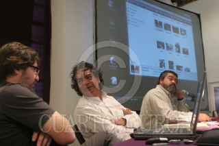 MÉXICO, D.F., 04SEPTIEMBRE2009.- Dani Yako editor del Diario El Clarín, Pedro Valtiera, director de la revista Cuartoscuro y Frabrizio León, editor de fotografía de La Jornada durante el foro El fotógrafo como editor III en el Centro de la Imagen. FOTO: IVÁN STEPHENS/CUARTOSCURO.COM