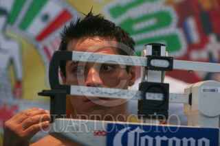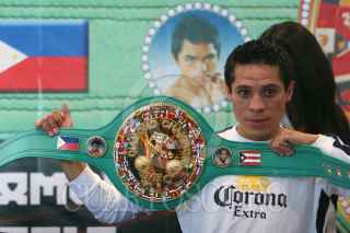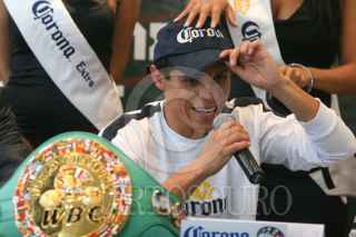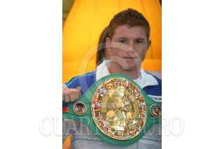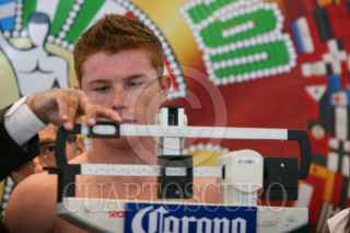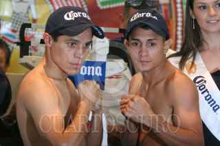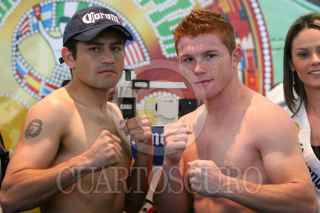 MÉXICO, D.F., 08SEPTIEMBRE2009.-Carlos "El Gitano" Herrera, posa en guardia con Saúl "Canelo" Álvarez, durante la ceremonia de pesaje con miras a la próxima función boxístca del próximo 15 de Septiembre en el Auditorio Siglo XXI de Puebla. Para el pelirrojo será su primera defensa del título mundial juvenil welter del CMB. FOTO: MOISÉS PABLO/CUARTOSCURO.COM