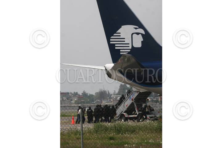 MEXICO, D.F., 09SEPTIEMBRE2009.- Elementos de la Policía Federal, resguardan en hangar de la PFP, despues que fueron trasladados a las instalaciones a los presuntos secuestradores del vuelo 576 de Aeroméxico que había sido retenido en el aeropuerto. FOTO: SAÚL LOPEZ/CUARTOSCURO.COM