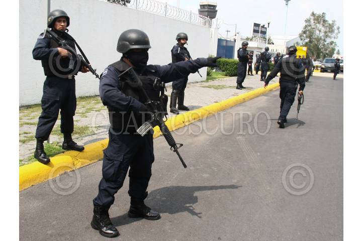 MEXICO, D.F., 09SEPTIEMBRE2009.- Elementos de la Policía Federal, resguardan en hangar de la PFP, despues que fueron trasladados a las instalaciones a los presuntos secuestradores del vuelo 576 de Aeroméxico que había sido retenido en el aeropuerto. FOTO: SAÚL LOPEZ/CUARTOSCURO.COM