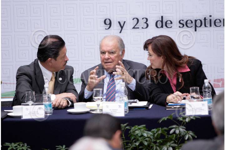 MEXICO,D.F., 09SEPTIEMBRE2009.- El senador Carlos Navarrete conversa con Enrique Iglesias, secretario general Iberoamericano en America Latina y la senadora Yeidkol Polevnesky durante la inauguración del foro "Una banca de desarrollo para el crecimiento economico y la generación de empleo". FOTO: CUARTOSCURO.COM