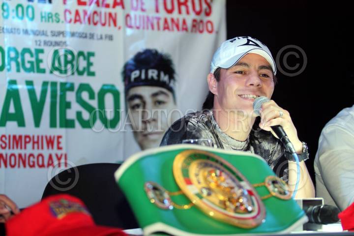 CANCÚN, QUINTANA ROO, 10SEPTIEMBRE2009.- Jorge "Travieso" Arce y Humberto "La Zorrita" Soto, durante la confencia de prensa para presentar la proxima pelea "Que Viva México De Un Solo Golpe", este 15 de septiembre en la plaza de toros de esta ciudad. En la gala boxistica tambien participara Ulises "El Archie" Solis y el nigeriano peso completo Samuel Peter. FOTO: AMARANTHA PRIETO/CUARTOSCURO.COM