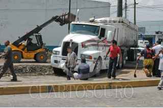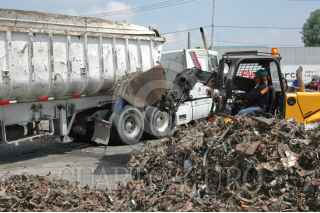 CUAUTITLÁN, ESTADO DE MÉXICO, 10SEPTIEMBRE2009.- Sobre la carretera Cuautitlán-Tlalnepantla se volcó un trailer marca Kenwooh, con 40 toneladas de "chicharrón", que iba a ser trasladado a la Siderúrgica Tultitlán S.A. de C.V., pero como el chófer de la unidad 493VV-4 conducía con exceso de velocidad perdió el control y el material quedo regado en la cinta asfáltica. En la colisión un taxi particular resultó dañado en la parte lateral. FOTO: MARIO NULO/CUARTOSCURO.COM