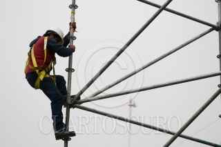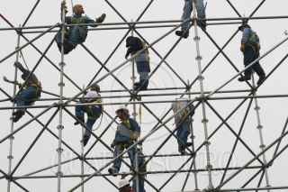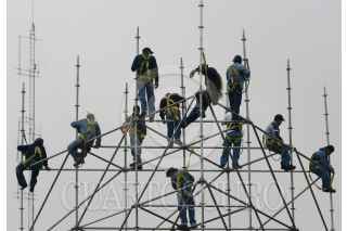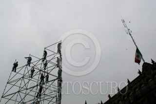 MÉXICO, D.F., 11SEPTIEMBRE2009.- Trabajadores del Gobierno del Distrito Federal trabajan en los últimos detalles en montar estructuras frente a Palacio de Ayuntamiento, donde este Martes 15 se realizará la celebración del bicentenario de la Independencia de México FOTO: SÁSHENKA GUTIÉRREZ/CUARTOSCURO.COM