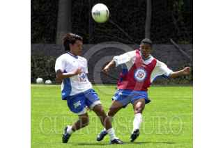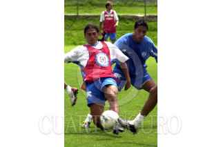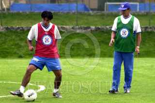 Cruz Azul se prepara para su próximo encuentro ante los Gallos Blancos del Queretaro dentro de la jornada 15 del torneo clausura 2003 del futbol mexicano. En la imágen, el delantero Juan Carlos Cacho y el técnico Enrique "El Ojitos" Meza. FOTO: Pedro Mera/CUARTOSCURO.COM