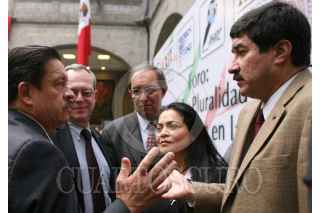 MÉXICO D.F., 11SEPTIEMBRE2009.- El Presidente del Senado Carlos Navarrete; Fran La Rue, relator, especial de Naciones Unidas para la promoción y protección de la libertad de expresión; Raul Trejo Delarbre, presidente de la Asociación Mexicana de Derecho a la Información; Aleida Calleja, vicepresidenta mundial de Radios Comunitarias y el senador Javier Corral conversan antes de dar inicio el foro: Diversidad y Pluraridad en los Medios Electrónicos en las Américas que se celebro en el patio del Senado de la República. FOTO: CUARTOSCURO.COM