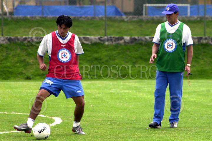 Cruz Azul se prepara para su próximo encuentro ante los Gallos Blancos del Queretaro dentro de la jornada 15 del torneo clausura 2003 del futbol mexicano. En la imágen, el delantero Juan Carlos Cacho y el técnico Enrique "El Ojitos" Meza. FOTO: Pedro Mera/CUARTOSCURO.COM