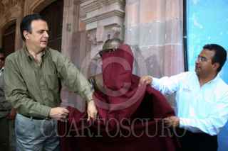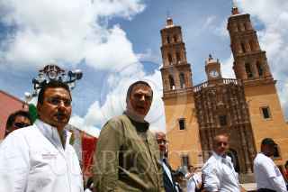 DOLORES, HIDALGO GUANAJUATO 12SEPTIEMBRE2009.- Marcelo Ebrard Jefe de Gobierno del Distrito Federal por el presidente municipal de la entidad Luis Gerardo Rubio recorren las calles de Hidalgo, durante la visita que ralizó el mandatario capitalino al estado teniendo a espaldas la catedral de Dolores FOTO: SÁSHENKA GUTIERREZ/CUARTOSCURO.COM
