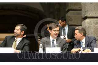 Juan Ramón de la Fuente, rector de la Universidad Autonóma de México (UNAM), José Woldemberg, presidente del Instituto Federal Electoral, y Roberto Madrazo, presidente del partido Revolucionario Institucional (PRI), durante el Foro "Manera de dialogar por México: Todos los Partidos Políticos" realizado por la UNAM en el patio central del palacio de Minería. FOTO: Eunice Adorno/CUARTOSCURO.COM