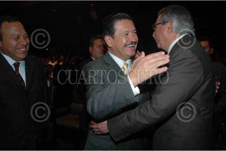 MÉXICO, D.F., 14SEPTIEMBRE2009.- Alejandro Encinas, coordinador de la bancada perredista en la Camara de Diputados, y Francisco Rojas, coordinador del Partido Revolucionario Institucional, durante la sesión conmemorativa del 135 Aniversario del Estado de Chiapas. FOTO: LUZ MORENO/CUARTOSCURO.COM