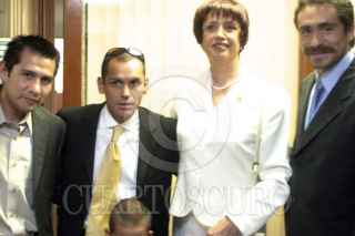 Los boxeadores Marco Antonio Barrera y Ricardo "finito" López, posan para la foto luego de una conferencia de prensa en la cámara de Diputados. FOTO: Juan Pablo Zamora/CUARTOSCURO.COM