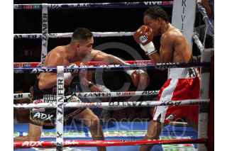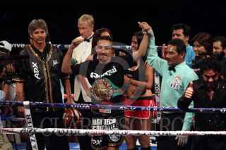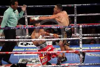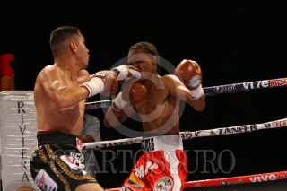 CANCÚN, QUINTANA ROO, 15SEPTIEMBRE2009.- El campeón Mundial por el CMB; Humberto "Zorrita" Soto retuvo esta noche su corona en la división de los Super Plumas al derrotar en el primer asalto a su rival Aristides "Papa" Perez que se realiza en la plaza de toros dentro de la función denominada !Que Viva México¡ De Un Solo Golpe III. FOTO: MARCO POLO GUZMÁN HERNÁNDEZ/CUARTOSCURO.COM