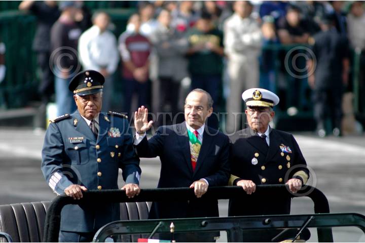 MÉXICO, D.F.16SEPTIEMBRE2009.- Carlos Navarrete, presidente del Senado de la República se despide del presidente Felipe Calderón al termino del Desfile Militar por el 199 aniversario del inicio de la lucha de Independencia que salio del Zócalo de la Ciudad de México hasta la Glorieta de la Diana Cazadora. FOTO: RODOLFO ANGULO/CUARTOSCURO.COM