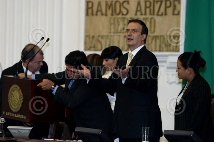 MÉXICO, D.F., 17SEPTIEMBRE2009.- Mariana Gomez del Campo coordinadora del PAN se despide del jefe de gobierno capitalino Marcelo Ebrard al termino de su mensaje en la sesión en donde rindió su Tercer Informe de Gobierno ante la Asamblea Legislativa del D.F. FOTO: RODOLFO ANGULO/CUARTOSCURO.COM