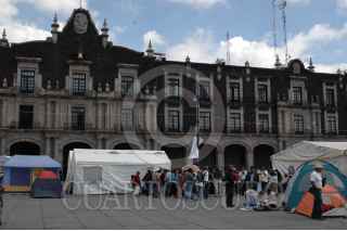 TOLUCA, ESTADO DE MÉXICO, 18SEPTIEMBRE2009.- Estudiantes de la universidad de Nezahualcóyotl y las preparatorioas de Chimalhuacán y San José del Rincón se plantaron frente al palacio de gobierno del estado de México en protesta por el incumplimiento en la otorgacion del registro ante la SEP y la Universidad estatal. Amenazaron con quedarse e instalaron tiendas de campaña hasta no ver resueltas sus demandas. FOTO: MARIO NULO/CUARTOSCURO.COM