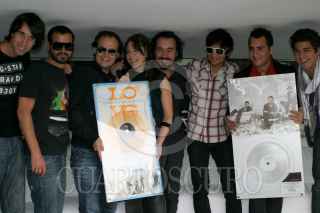 MÉXICO, D.F., 22SEPTIEMBRE2009.- Haritz Garde (batería), Álvaro Fuentes (bajo), Pablo Benegas (guitarra), Leire Martínez (vocalista) y Xabi San Martín (teclados), del grupo de pop español La Oreja de Van Gogh y durante la presentación de su disco de oro por sus exitosas ventas en la república mexicana, y Gilberto "Bibi" Marin (guitarra eléctrica), Jesús Alberto Navarro (vocalista) y Julio Ramirez Eguia (guitarra acustica) de la agrupación mexicana Reik, durantela presentación de su gira de conciertos (Juntos e Inolvidable Tour). esto sucedió en las instalaciones de un conocido hotel de la zona de Polanco. FOTO: MISAEL VALTIERRA/CUARTOSCURO.COM