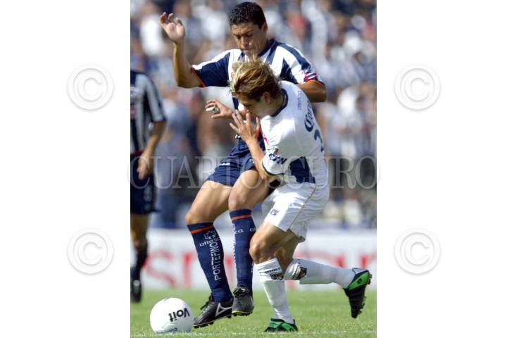 Jesus Arellano(Mty) y Jose Milian(San Luis) disputan el balon durante el juego correspondiente a la jornada 17 entre Monterrey y San Luis donde el equipo de casa gano por 3-1. FOTO: Garuda Dassa/CUARTOSCURO.COM