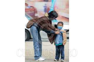 MÉXICO D.F. 25SEPTIEMBRE2009.- Una madre abriga a su hijo y toma las medidas precautorias correspondientes ante el eventual rebrote de influenza AH1N1 en el país. FOTO: IVAN STEPHENS/CURTOSCURO.COM