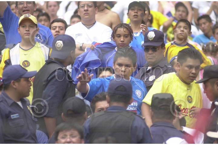 Luego del 3-1 de Cruz Azul sobre el América en el llamado "clásico jóven", algunos jóvenes discutieron con los elementos de seguridad. FOTO: Juan Pablo Zamora/CUARTOSCURO.COM