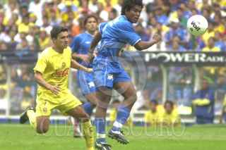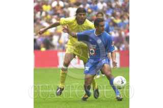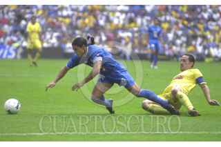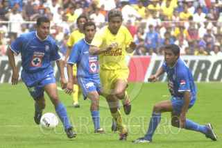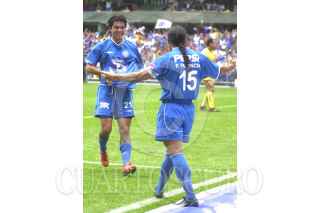 Juan Carlos Cacho festeja con Francisco Palencia el tercer gol de Cruz Azul, quien venció 3-1 al América en el llamado "clásico jóven" en el estadio Azteca. FOTO: Juan Pablo Zamora/CUARTOSCURO.COM