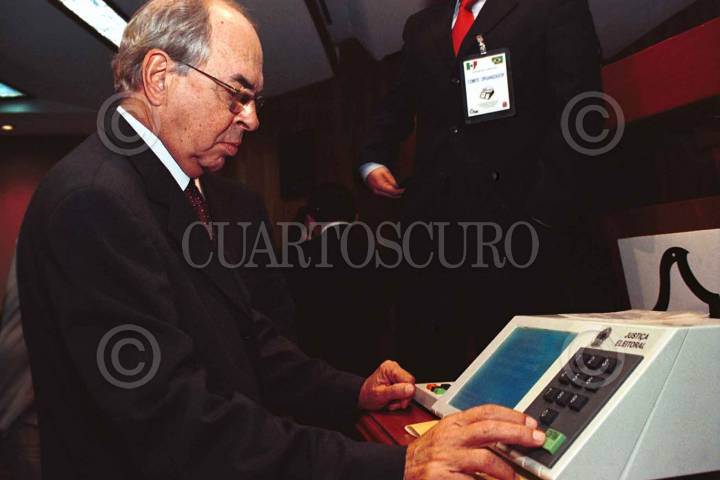 Javier Santiago Castillo, consejero presidente del IEDF y José Paulo Sepúlveda Pertence, presidente del Tribunal Electoral de Brasil. Durante la firma de acuerdo de cooperación técnica para el desarrollo de la prueba piloto con el uso de urnas electrónicas el 6 de Julio de 2003. FOTO: Isaac Aguilar/CUARTOSCURO.COM