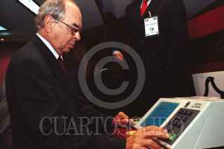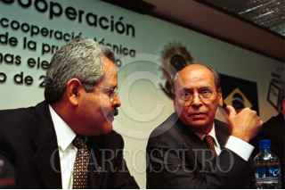 Javier Santiago Castillo, consejero presidente del IEDF y José Paulo Sepúlveda Pertence, presidente del Tribunal Electoral de Brasil. Durante la firma de acuerdo de cooperación técnica para el desarrollo de la prueba piloto con el uso de urnas electrónicas el 6 de Julio de 2003. FOTO: Isaac Aguilar/CUARTOSCURO.COM