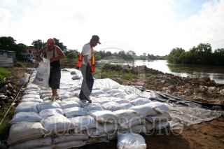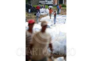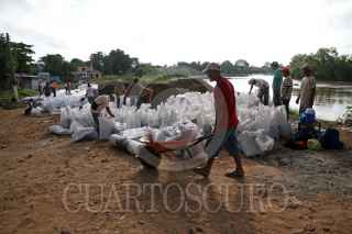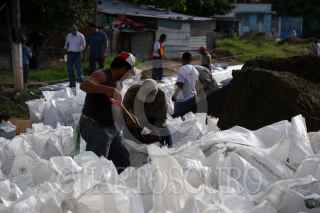 VILLAHERMOSA, TABASCO, 30SEPTIEMBRE2009.- Empleados temporales contratados por la CONAGUA realizan el amurallamiento con costales de arenas sobre el malecón Leandro Rovirosa de la colonia Gaviotas Sur. Sobre este sector el nivel del río Grijalva se torna peligroso ya que sus niveles de agua pueden rebasar su escala critica de un momento a otro. FOTO: MARCO POLO GUZMÁN HERNÁNDEZ/CUARTOSCURO.COM