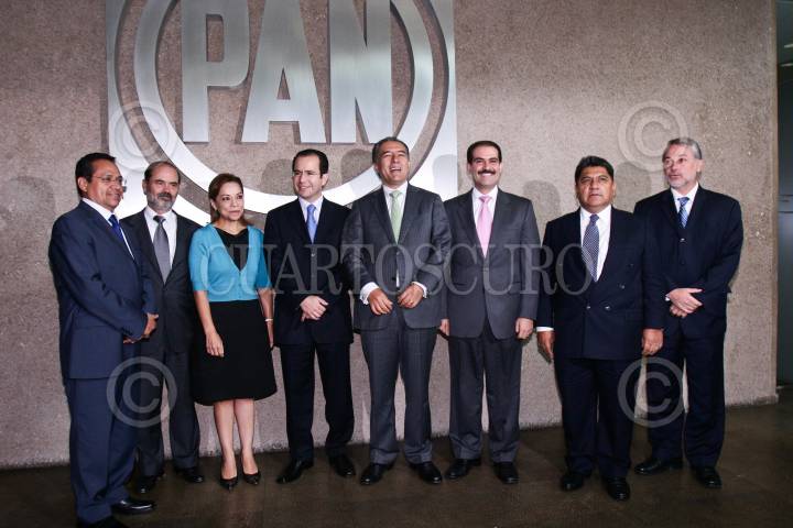 MÉXICO D.F., 29SEPTIEMBRE2009.- Luis Armando Reynoso Femat, gobernador de Aguascalientes; los coordinadores parlamentarios Gustavo Madero y Josefina Vázquez Mota; los gobernadores Marco Antonio Adame, de Morelos; Guillermo Padrés, de Sonora; Juan Manuel Oliva, de Guanajuato; Héctor Ortiz Ortiz, de Tlaxcala; Emilio González Márquez, de Guadalajara; y César Nava, líder nacional del PAN, ofrecieron una conferencia de prensa donde respaldaron el paquete económico propuesto por el gobierno federal. Asimismo, los gobernadores emanados de Acción Nacional anunciaron un programa de austeridad que comprende la reducción de secretarías locales, congelamiento de salarios y plazas, así como cancelar la adquisición de vehículos nuevos y eliminar gastos de representación, comidas y transporte que no se justifiquen. FOTO: ISAAC ESQUIVEL/CUARTOSCURO.COM