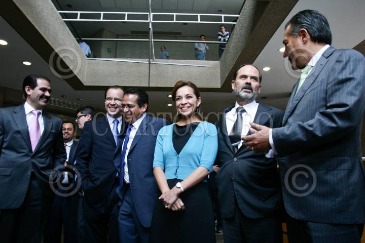 MÉXICO D.F., 29SEPTIEMBRE2009.- Luis Armando Reynoso Femat, gobernador de Aguascalientes; los coordinadores parlamentarios Gustavo Madero y Josefina Vázquez Mota; los gobernadores Marco Antonio Adame, de Morelos; Guillermo Padrés, de Sonora; Juan Manuel Oliva, de Guanajuato; Héctor Ortiz Ortiz, de Tlaxcala; Emilio González Márquez, de Guadalajara; y César Nava, líder nacional del PAN, ofrecieron una conferencia de prensa donde respaldaron el paquete económico propuesto por el gobierno federal. Asimismo, los gobernadores emanados de Acción Nacional anunciaron un programa de austeridad que comprende la reducción de secretarías locales, congelamiento de salarios y plazas, así como cancelar la adquisición de vehículos nuevos y eliminar gastos de representación, comidas y transporte que no se justifiquen. FOTO: ISAAC ESQUIVEL/CUARTOSCURO.COM