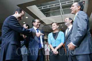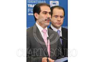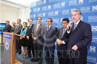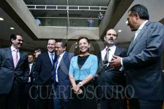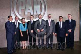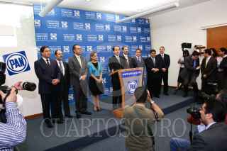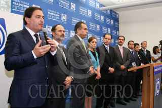 MÉXICO D.F., 29SEPTIEMBRE2009.- Luis Armando Reynoso Femat, gobernador de Aguascalientes; los coordinadores parlamentarios Gustavo Madero y Josefina Vázquez Mota; los gobernadores Marco Antonio Adame, de Morelos; Guillermo Padrés, de Sonora; Juan Manuel Oliva, de Guanajuato; Héctor Ortiz Ortiz, de Tlaxcala; Emilio González Márquez, de Guadalajara; y César Nava, líder nacional del PAN, ofrecieron una conferencia de prensa donde respaldaron el paquete económico propuesto por el gobierno federal. Asimismo, los gobernadores emanados de Acción Nacional anunciaron un programa de austeridad que comprende la reducción de secretarías locales, congelamiento de salarios y plazas, así como cancelar la adquisición de vehículos nuevos y eliminar gastos de representación, comidas y transporte que no se justifiquen. FOTO: ISAAC ESQUIVEL/CUARTOSCURO.COM