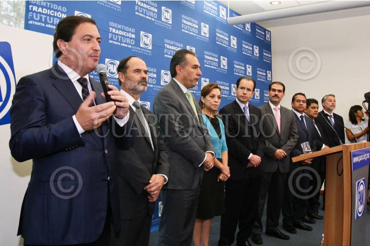 MÉXICO D.F., 29SEPTIEMBRE2009.- Luis Armando Reynoso Femat, gobernador de Aguascalientes; los coordinadores parlamentarios Gustavo Madero y Josefina Vázquez Mota; los gobernadores Marco Antonio Adame, de Morelos; Guillermo Padrés, de Sonora; Juan Manuel Oliva, de Guanajuato; Héctor Ortiz Ortiz, de Tlaxcala; Emilio González Márquez, de Guadalajara; y César Nava, líder nacional del PAN, ofrecieron una conferencia de prensa donde respaldaron el paquete económico propuesto por el gobierno federal. Asimismo, los gobernadores emanados de Acción Nacional anunciaron un programa de austeridad que comprende la reducción de secretarías locales, congelamiento de salarios y plazas, así como cancelar la adquisición de vehículos nuevos y eliminar gastos de representación, comidas y transporte que no se justifiquen. FOTO: ISAAC ESQUIVEL/CUARTOSCURO.COM