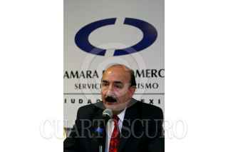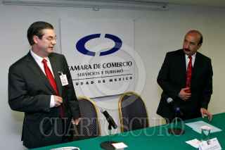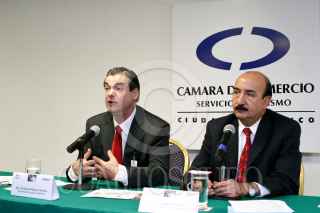 MÉXICO, D.F., 01OCTUBRE2009.- Santiago Macias Herrera, coordinador General COMPITE y Arturo Mendicuti Narro, titular de la Cámara de Comercio, Servicios y Turismo de la Ciudad de México (CANACO) durante una conferencia de prensa que ofrecieron a los medios de comunicación. FOTO: RODOLFO ANGULO/CUARTOSCURO.COM