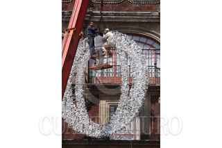 MÉXICO, D.F., 03OCTUBRE2009.- Trabajadores del GDF retiran los adornos de las fiestas patrias colocados sobre los edificios que se ubican alrededor del Zócalo. FOTO: MOISÉS PABLO/CUARTOSCURO.COM