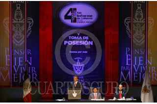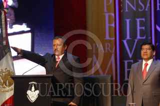 PUEBLA, PUEBLA, 04OCTUBRE2009.- Enrique Agüera Ibañez, rector de la Benemérita Universidad Autónoma de Puebla (BUAP), rindió su cuarto informe de actividades y tomó protesta para dirigir a la máxima casa de estudios del estado para el periodo 2009-2013. Teniendo como testigos al gobernador del estado, Mario Marín Torres y diversas personalidades de la vida política y académica, Agüera Ibañez reafirmó que está comprometido con la institución y luchará para defender a la universidad pública. FOTO: FRANCISCO GUASCO/CUARTOSCURO.COM